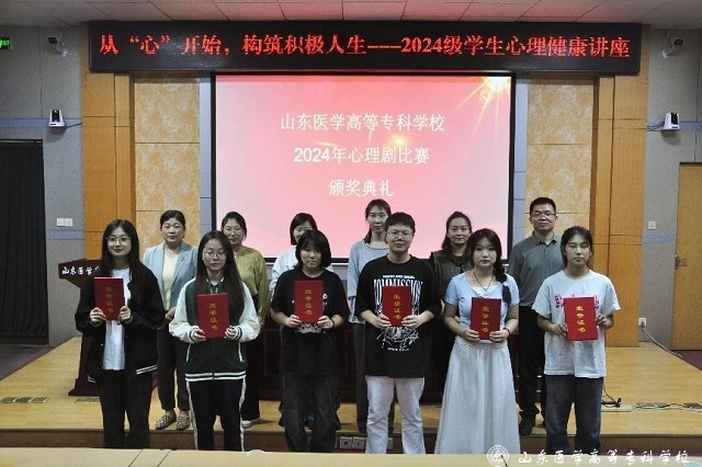 根据山东省教育厅通知要求,我校于9月中旬举办了心理剧比赛,各系部共推荐19部作品,经过评选,选出一等奖2个,二等奖4个,三等奖6个,优秀奖7个。颁奖典礼上,各系负责心理工作的辅导员老师为获奖学生代表颁奖。