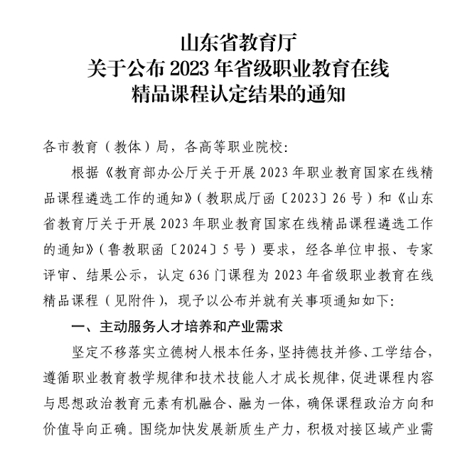 近日,山东省教育厅公布了2023年山东省职业教育在线精品课程评选认定结果,我校5门课程榜上有名。