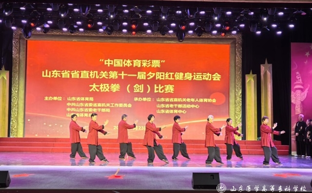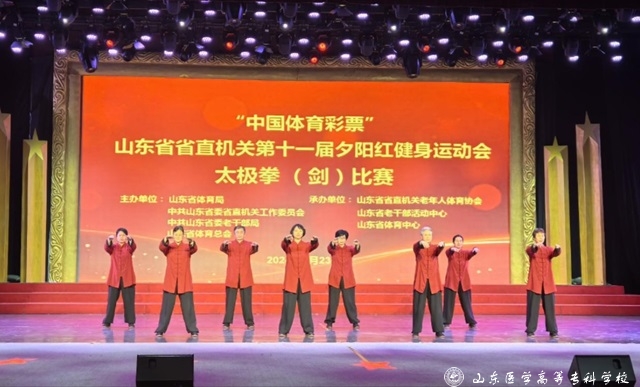 7月23日,山东省省直机关第十一届夕阳红健身运动会太极拳比赛在省老干部活动中心举办,山东医专济南校区八名离退休老同志代表省卫生健康委参加比赛,荣获优胜奖。省卫生健康委离退处处长陈宪钧、离退处一级调研员夏继忠,学校党委委员、副校长程智军同志出席活动。
