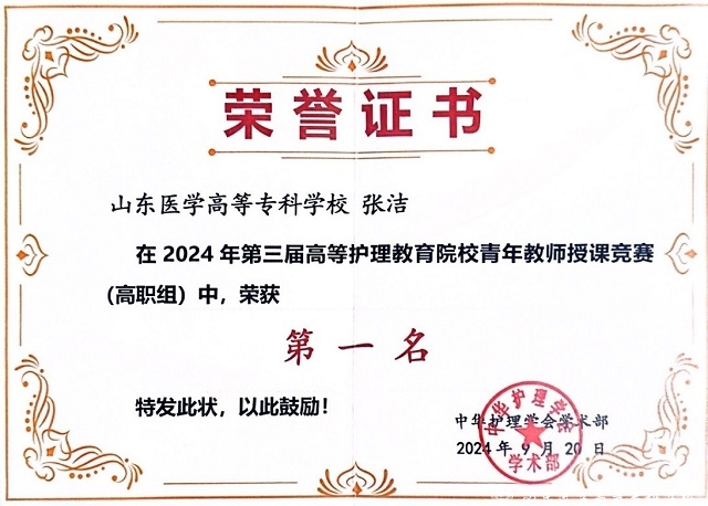 本次比赛由中华护理学会主办,面向全国各高等教育本、专科护理院校,分为省级初赛和全国决赛。张洁在在省级选拔赛中以优异成绩胜出,代表山东省参加全国比赛;在全国决赛中,共有来自31个省市(自治区)169所院校的171名青年教师同台竞技,张洁展示出了扎实的教学功底,先进的教学理念,创新的思维方式和良好的专业素质,经过激烈的角逐,最后获得高职组第一名。