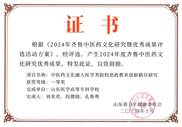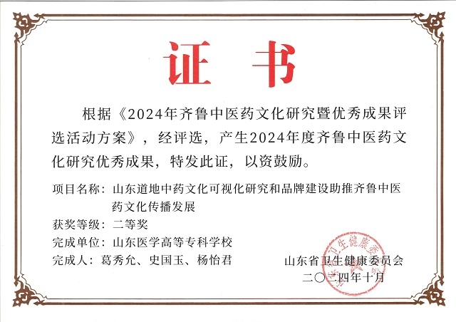 近日,山东省卫生健康委员会公布了2024年齐鲁中医药文化研究结题项目及优秀成果名单,我校《中医药文化融入医学类院校思政教育创新路径研究》(主持人:刘美君)和《山东道地中药文化可视化研究和品牌建设助推齐鲁中医药文化传播发展》(主持人:葛秀允)两项研究成果分别荣获一等奖和二等奖。