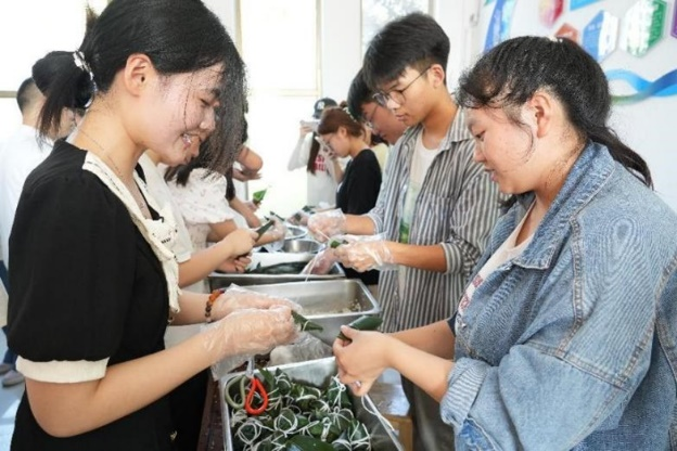 餐厅师傅早早做好准备,碧绿飘香的粽叶,雪白洁净的糯米,晶莹剔透的蜜枣……餐厅师傅带领学生们卷起粽叶、填上糯米、放上馅料、系上棉绳,将传统文化“包”进粽子里,让大家更近距离感受传统文化的独特魅力,增强了学生爱国爱乡的情感。